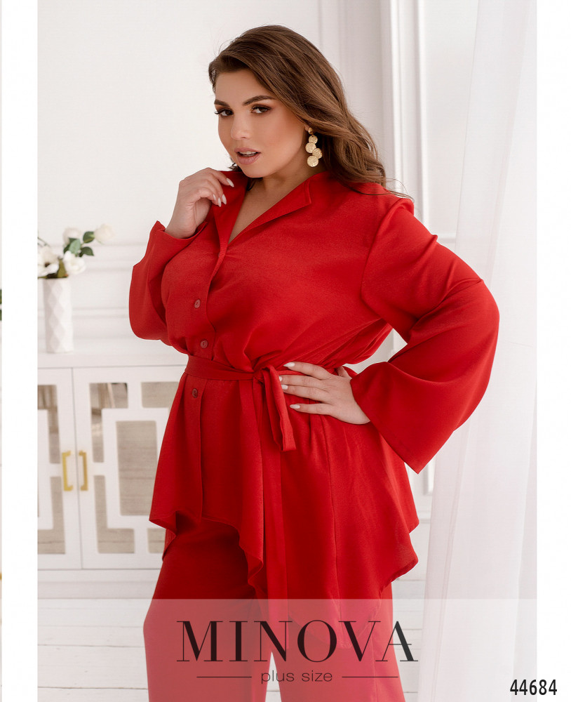 Оригинальный и привлекательный костюм большого размера. Рубашка с шлейками для пояса на талии, воротничок мягкий отложной, рукава без манжет, подол асимметричный, по бокам длиннее. Застёгивается на ряд пуговиц спереди на планке. Брюки с высокой талией, в пояс вшита резинка, по бокам - карманы в шве, застёжек нет. Пояс/аксессуар входит в комплект.