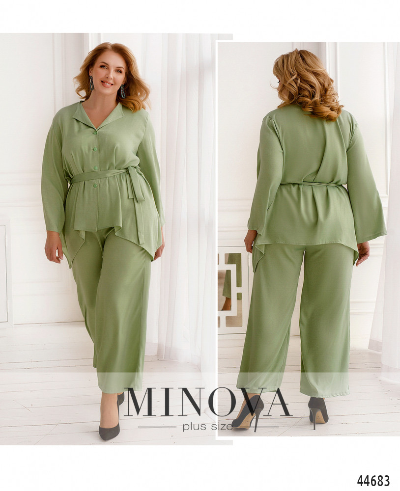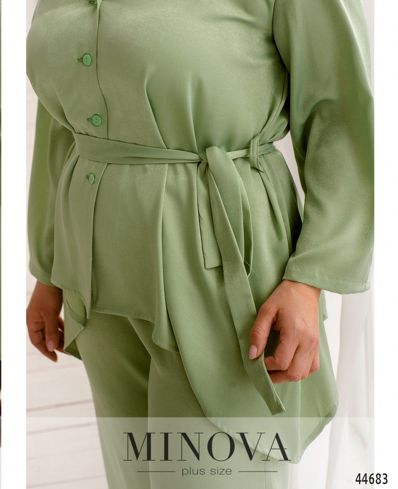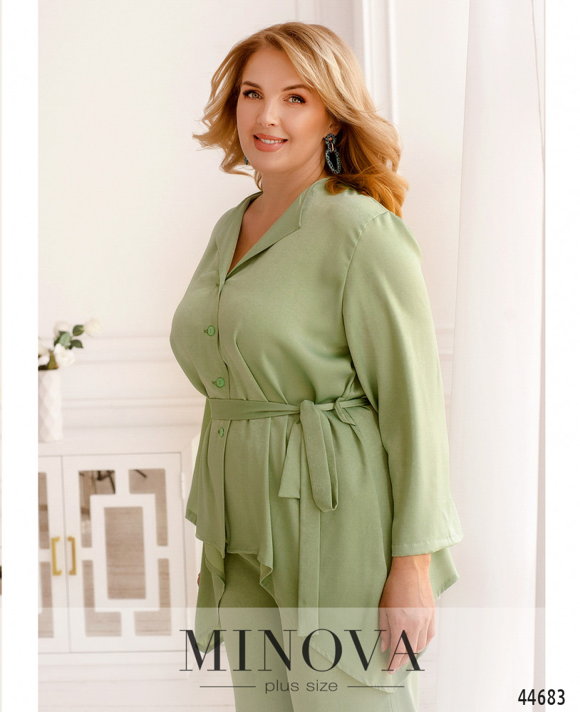 Оригинальный и привлекательный костюм большого размера. Рубашка с шлейками для пояса на талии, воротничок мягкий отложной, рукава без манжет, подол асимметричный, по бокам длиннее. Застёгивается на ряд пуговиц спереди на планке. Брюки с высокой талией, в пояс вшита резинка, по бокам - карманы в шве, застёжек нет. Пояс/аксессуар входит в комплект.