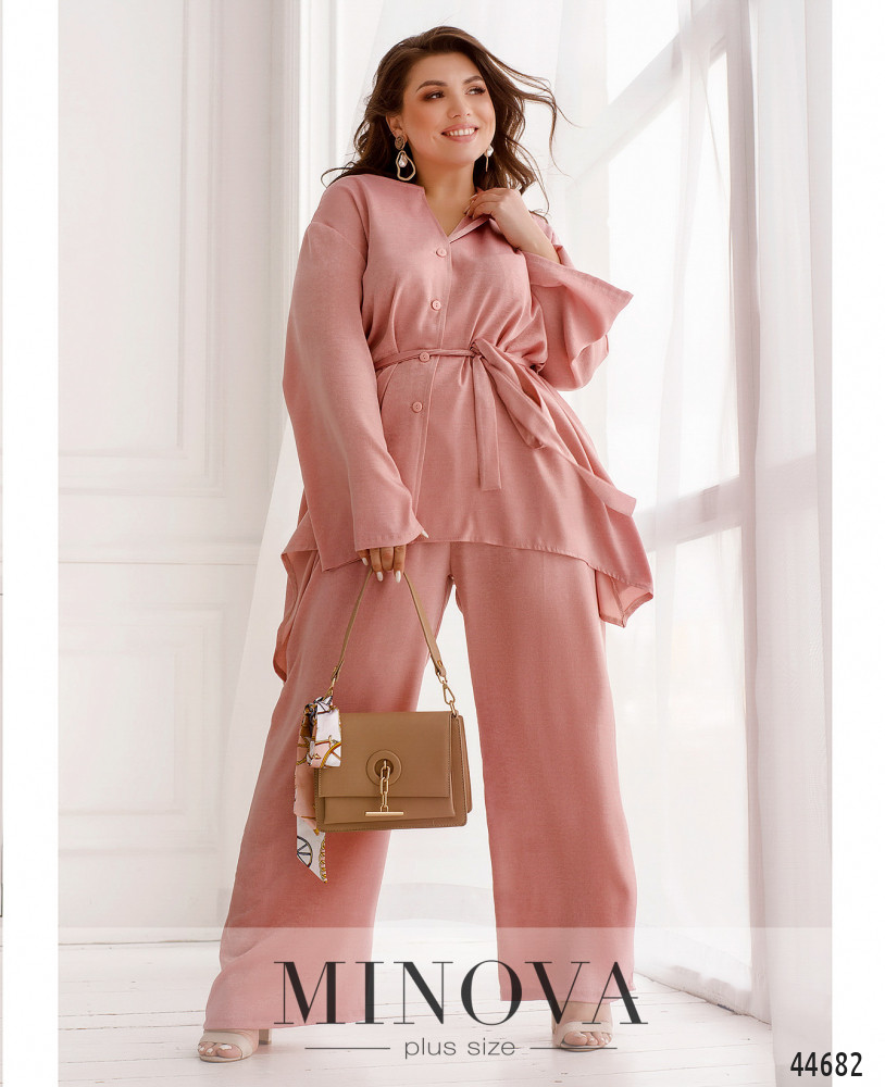 Оригинальный и привлекательный костюм большого размера. Рубашка с шлейками для пояса на талии, воротничок мягкий отложной, рукава без манжет, подол асимметричный, по бокам длиннее. Застёгивается на ряд пуговиц спереди на планке. Брюки с высокой талией, в пояс вшита резинка, по бокам - карманы в шве, застёжек нет. Пояс/аксессуар входит в комплект.