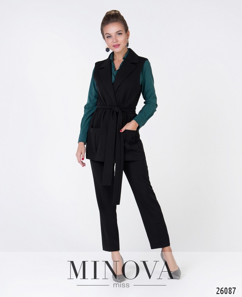 Удлинённый жилет с отложенным воротником. По бокам два объемных кармана. Жилет