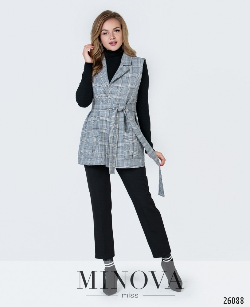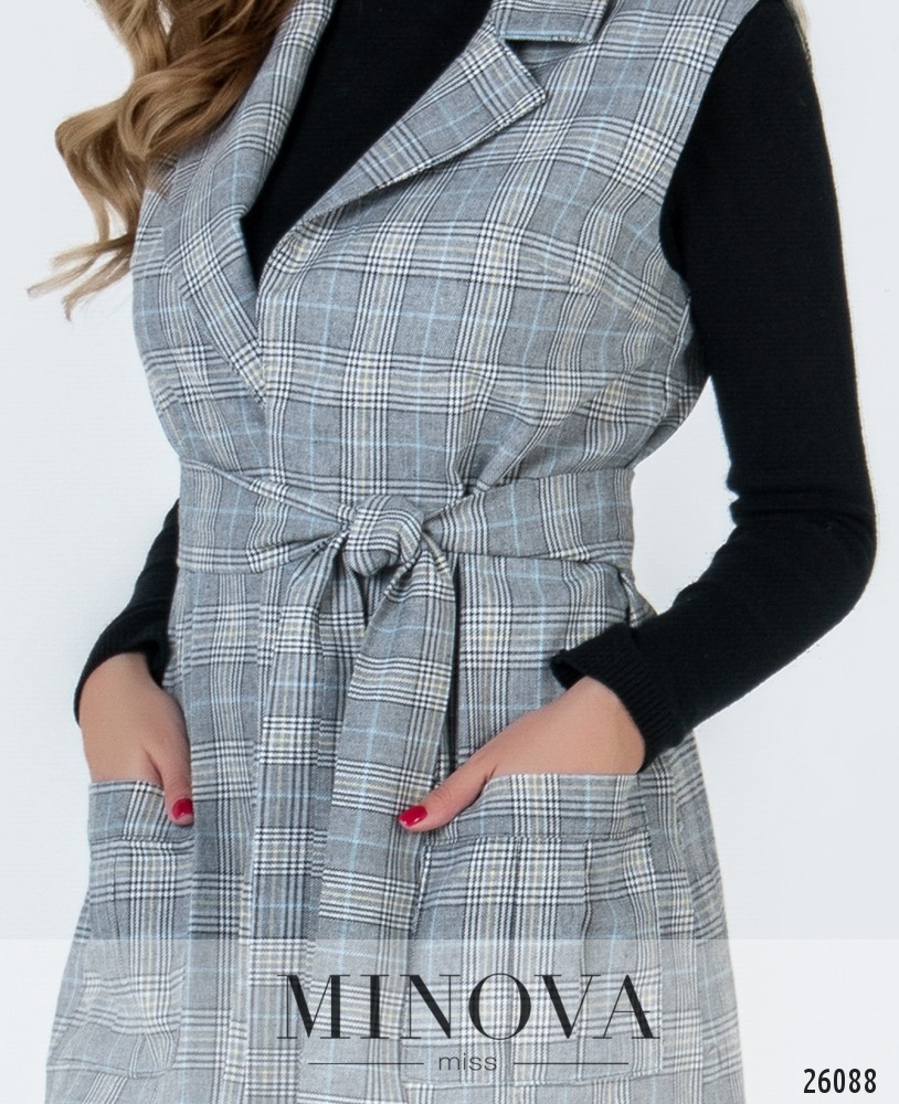 Удлинённый жилет с отложенным воротником. По бокам два объемных кармана. Жилет
