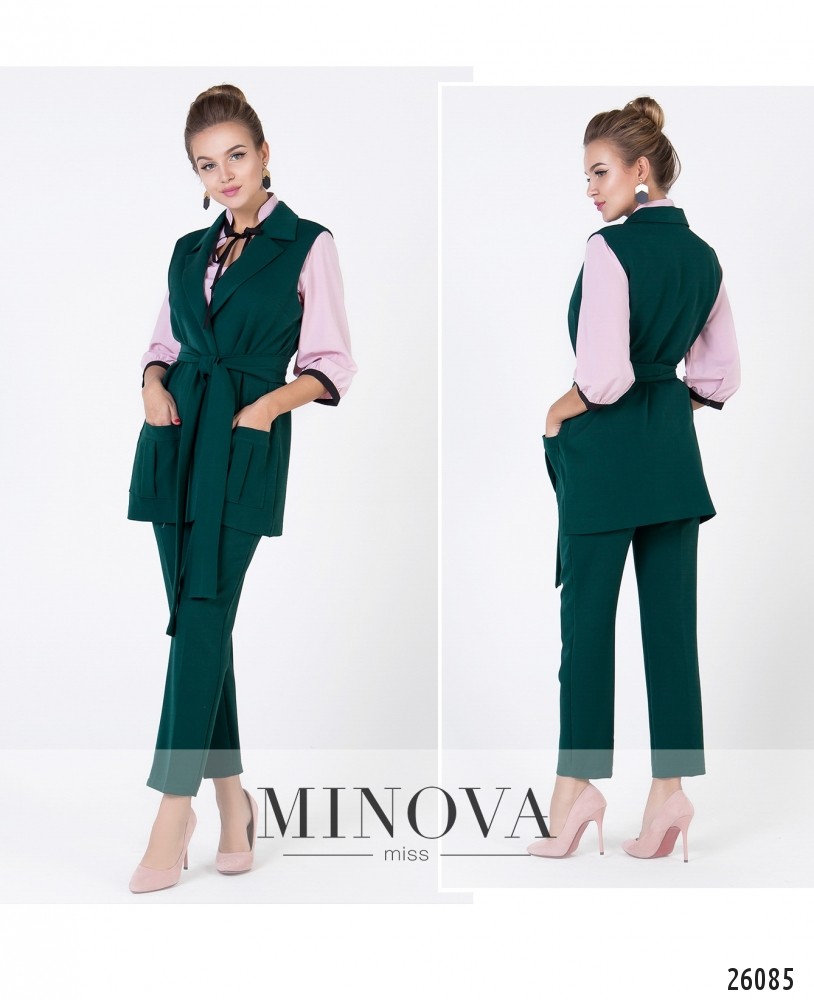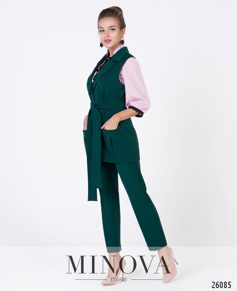 Стильный костюм двойка в деловом стиле: Брюки зауженного кроя, средней посадки, застёгиваются на молнию и пуговицу.  По бокам два функционирующих кармана. Удлинённый жилет с отложенным воротником. По бокам два объемных кармана. Жилет завязывается на пояс.