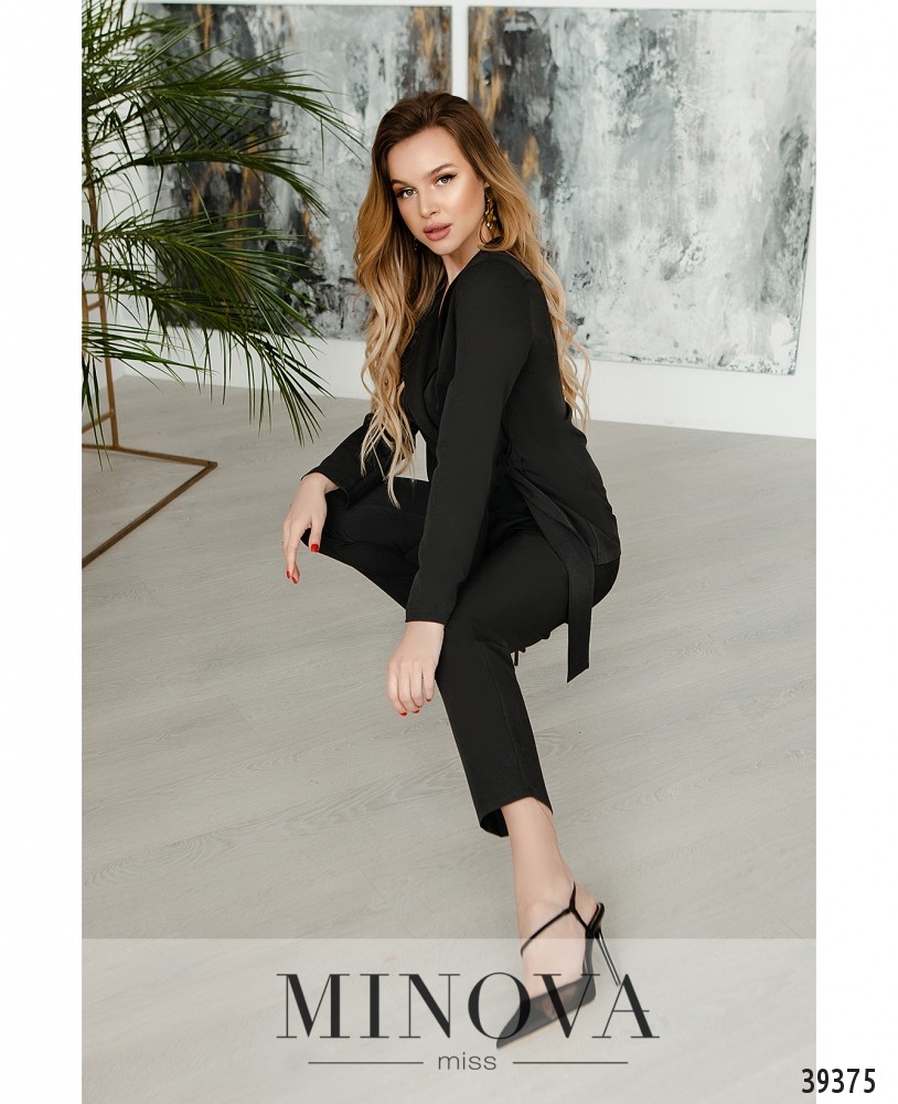 Минималистичный привлекательный костюм с жакетом и брюками. Жакет с подплечниками, без карманов, без застёжек, завязывается на подшитый сбоку поясок. Рукава без манжет. Подкладки нет. На груди вытачки. Брюки со средней посадкой, застёгиваются на змейку под ширинкой и на пуговицу, по бокам - врезные карманы, без манжет. На поясе - шлевки для ремня.
