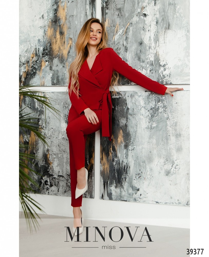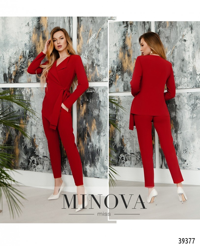Минималистичный привлекательный костюм с жакетом и брюками. Жакет с подплечниками, без карманов, без застёжек, завязывается на подшитый сбоку поясок. Рукава без манжет. Подкладки нет. На груди вытачки. Брюки со средней посадкой, застёгиваются на змейку под ширинкой и на пуговицу, по бокам - врезные карманы, без манжет. На поясе - шлевки для ремня.