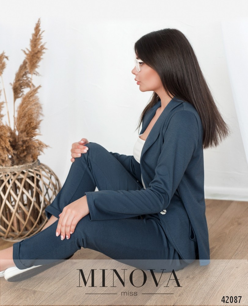 Элегантный костюм-двойка с брюками и пиджаком. Пиджак без подкладки, лацканы гладкие. Рукава без пуговиц. Однобортный, застёгивается на одну пуговицу. Брюки с высокой посадкой, в пояс вшита резинка и пропущен шнурок, по бокам - врезные карманы, снизу небольшие манжеты.