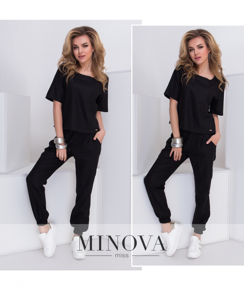 Комфортный брючный костюм состоит из укороченного топа и зауженных брюк. Топ прямого кроя с короткими рукавами дополнен золотистой деталью. Брюки с защипами на высокой посадке на резинке дополнены карманами. Внизу штанина собрана на резинку.