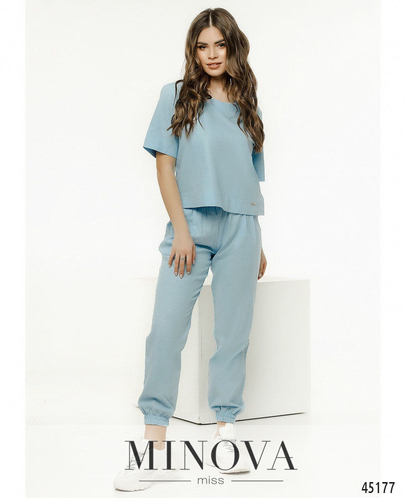 Удобный повседневный минималистичный костюм-двойка с футболкой и брюками. Брюки с высокой посадкой, в пояс вшита резинка, в манжеты также вшиты резинки, по бокам - врезные карманы. Футболка без карманов и застёжек.