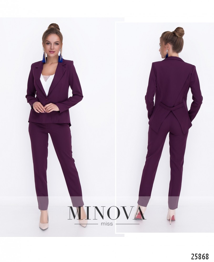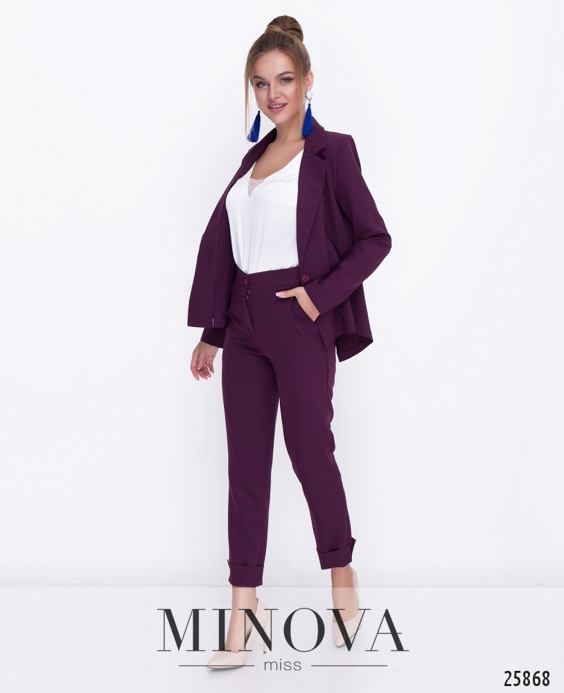 Брючный костюм-двойка в деловом стиле. Слегка приталенный пиджак с отложным воротником застегивается на одну пуговицу. Спинка выполнена в стиле фрака с двумя бортами и дополнена планкой на талии. Классические зауженные брюки с манжетами и разрезами. Брюки дополнены карманами. Пояс застегивается на пуговицу и молнию. Данная модель будет выгодной инвестицией в повседневный гардероб, так как прослужит в два сезона: осень и весну.