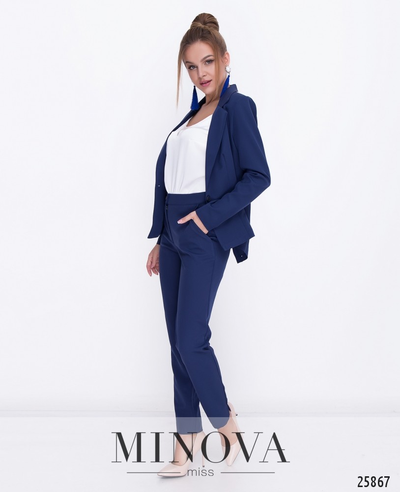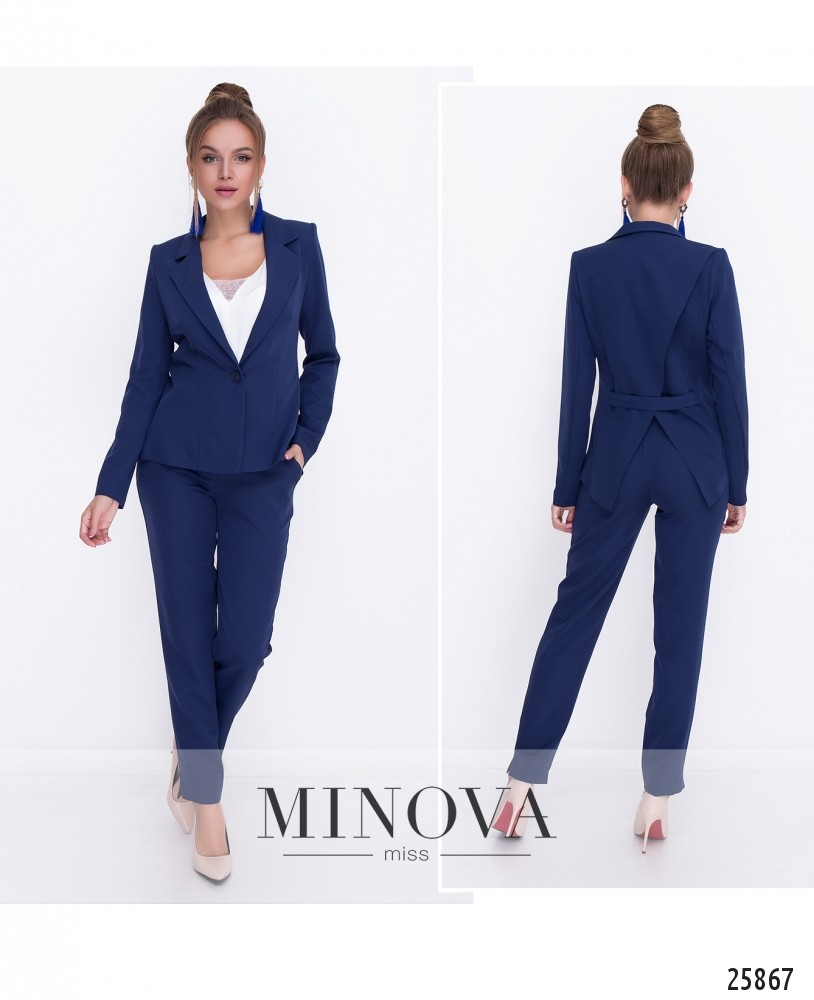 Брючный костюм-двойка в деловом стиле. Слегка приталенный пиджак с отложным воротником застегивается на одну пуговицу. Спинка выполнена в стиле фрака с двумя бортами и дополнена планкой на талии. Классические зауженные брюки с манжетами и разрезами. Брюки дополнены карманами. Пояс застегивается на пуговицу и молнию. Данная модель будет выгодной инвестицией в повседневный гардероб, так как прослужит в два сезона: осень и весну.