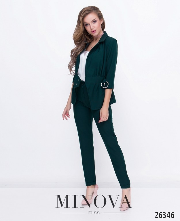 Стильный костюм в повседневно-офисном стиле. Жакет с рукавами до локтя и отложенным воротником. На талии вшивной пояс с объёмной железной застежкой и с драпировкой.