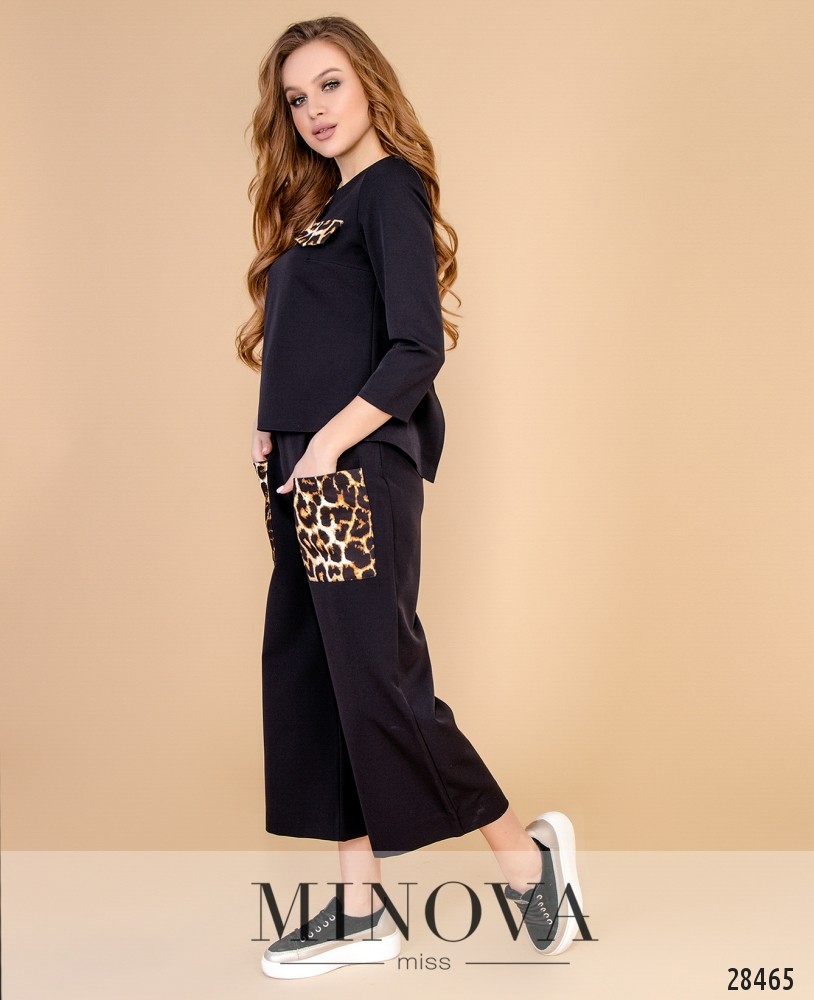 Стильный костюм-двойка с леопардовыми акцентами. Костюм представлен блузой и брюками-кюлотами. Блуза на груди скроена с вытачками у крашена декоративным кармашком. На спине горловина застегивается на пуговицу. От кокетки спускается клиньевая вставка с принтом «леопард». Брюки кюлоты украшены крупными принтованными накладными карманами. Пояс брюк представлен планкой. Брюки застегиваются на боковую скрытую молнию.