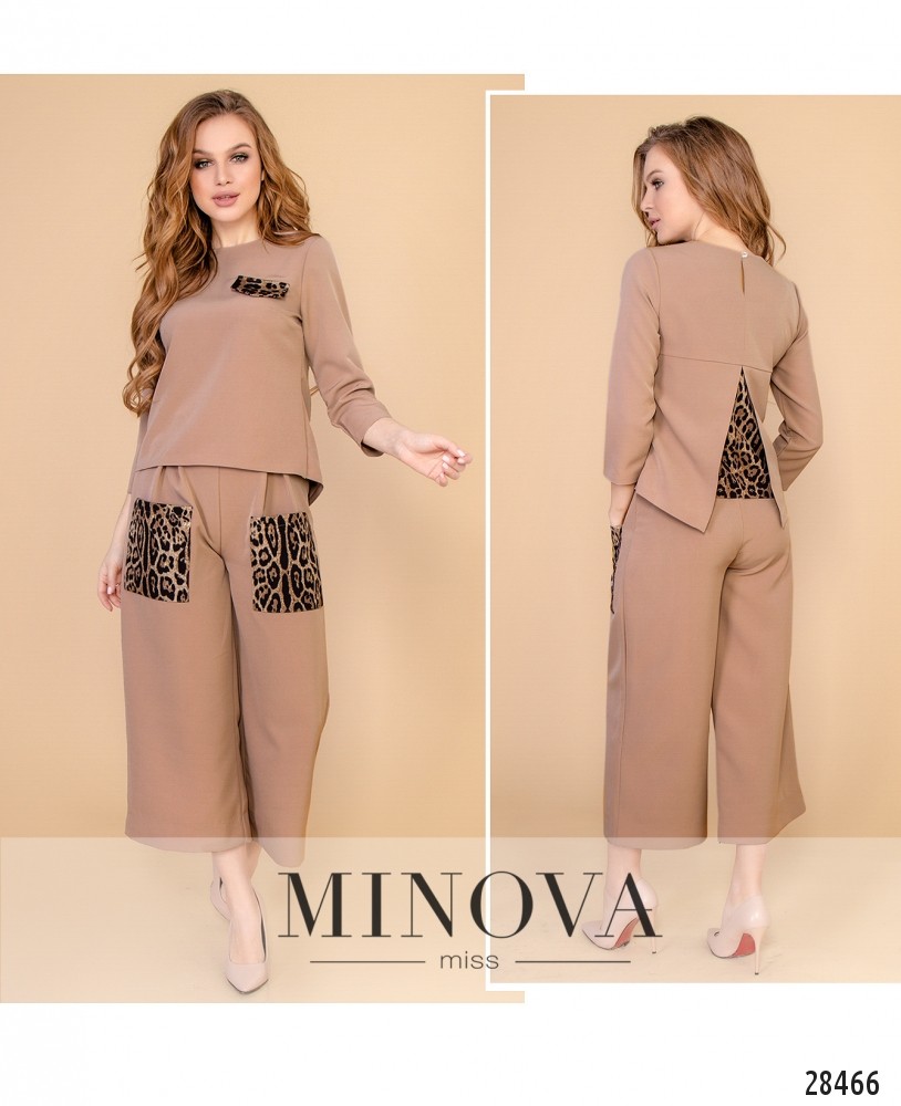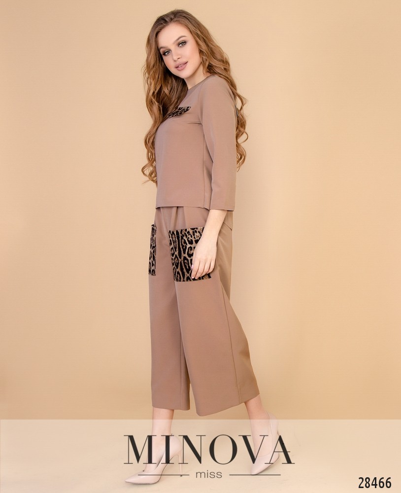 Стильный костюм-двойка с леопардовыми акцентами. Костюм представлен блузой и брюками-кюлотами. Блуза на груди скроена с вытачками у крашена декоративным кармашком. На спине горловина застегивается на пуговицу. От кокетки спускается клиньевая вставка с принтом «леопард». Брюки кюлоты украшены крупными принтованными накладными карманами. Пояс брюк представлен планкой. Брюки застегиваются на боковую скрытую молнию.