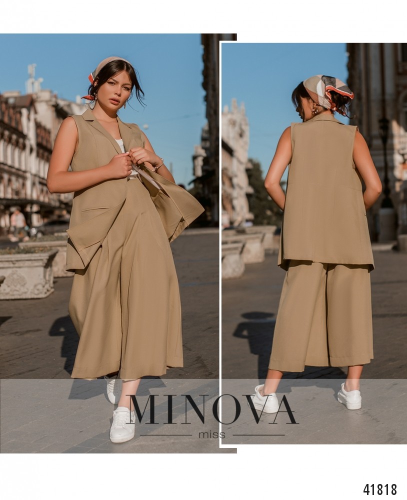 Стильный костюм-двойка с жилеткой и кюлотами. Кюлоты с высокой талией, застёгиваются на молнию, вшитую слева, ткань на талии присобрана оборками. Жилетка без подкладки, однобортная, с одной пуговицей, с врезными карманами.