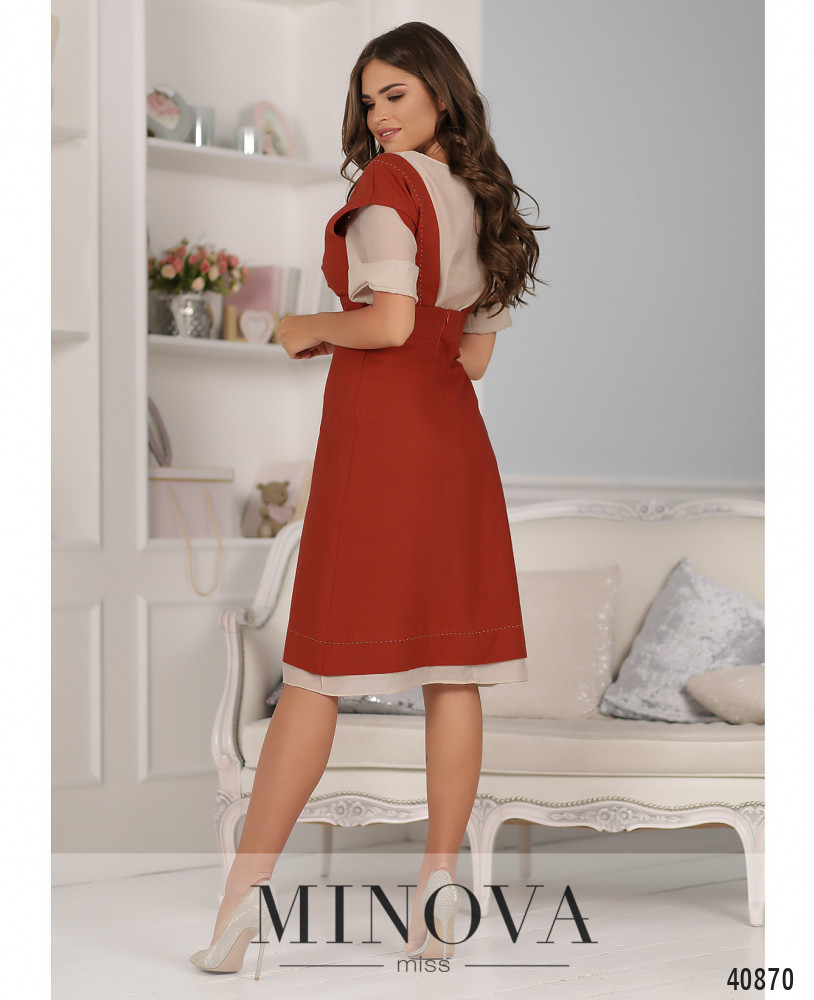 Оригинальный костюм с сарафаном и лёгкой кофточкой. Сарафан без карманов, застёгивается на молнию, вшитую по спинке. Снизу на подоле подшита лёгкая ткань, как на блузе. Вырез украшен спереди и по спинке декоративной строчкой-швом. Блуза без застёжек и карманов, с небольшими отворотами на рукавах, вырез горловины "лодочка".