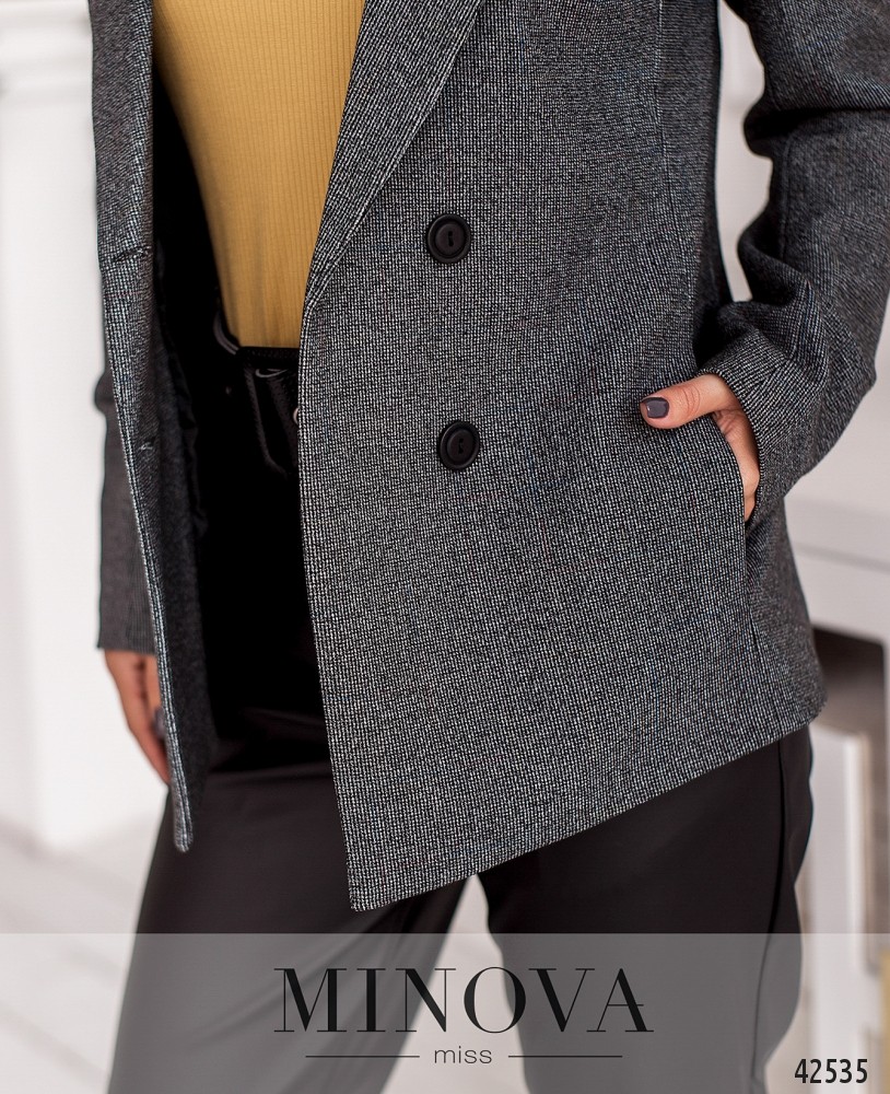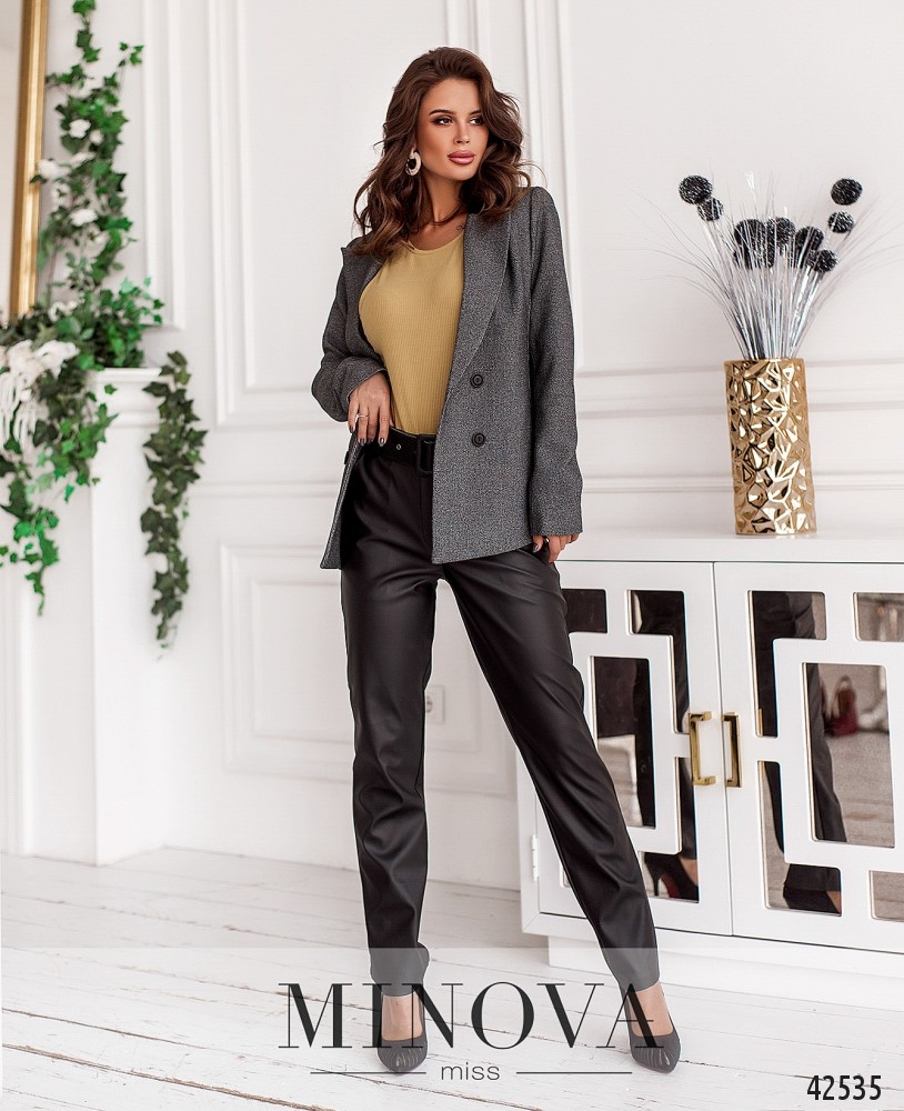 Оригинальный костюм-двойка с пиджаком и брюками. Пиджак с подплечниками и подкладкой, двубортный, застёгивается на левый ряд пуговиц. Верхняя часть лацканов из той же ткани, из которой изготовлены брюки. Ткань перфорирована. По бокам - врезные карманы. Брюки с высокой талией, изнутри ткань мягкая, застёгиваются на пуговицу и молнию под ширинкой. По бокам - врезные карманы, в наличии шлейки для ремня. Пояс в наличии, с несквозной декоративной перфорацией.