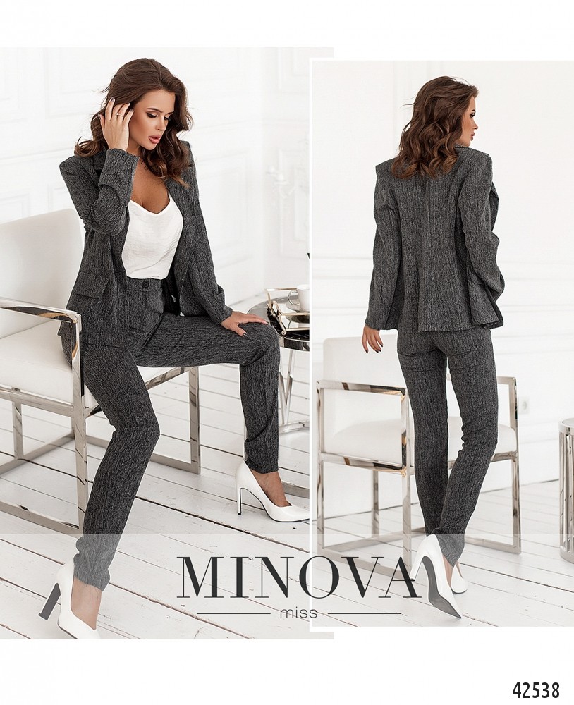 Деловой костюм с пиджаком и брюками. Пиджак без подкладки, приталенный, с подплечниками, застёгивается на одну пуговицу. Карманов нет, есть декоративные клапаны. Брюки с высокой талией, застёгиваются на молнию под ширинкой и пуговицу. По бокам - врезные карманы, на талии шлейки для ремня.