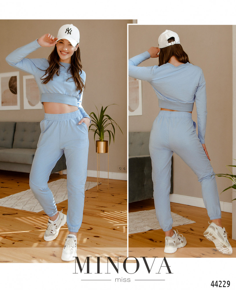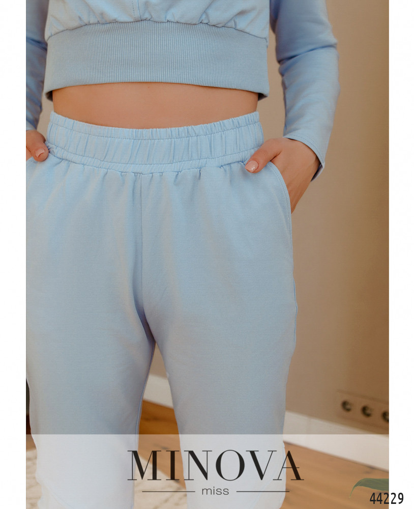 Минималистичный костюм со свитшотом и брюками. Свитшот с мягким манжетом на подоле и на горловине, рукава без манжет, по центру - декоративный шов. Без застёжек и карманов. Брюки со вшитыми в пояс и в манжеты резинками, с декоративным диагональным швом, по бокам - карманы в шве, посадка высокая.