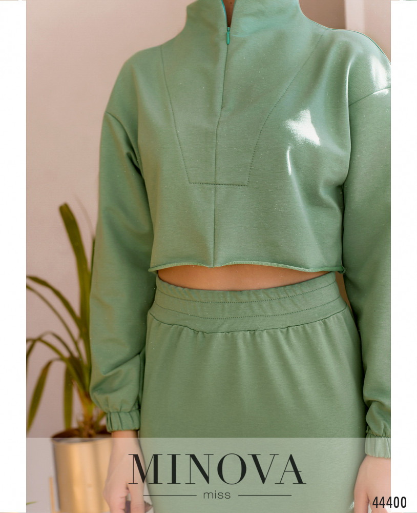 Удобный и нежный костюм с кофточкой и юбкой. Юбка-карандаш, в пояс вшита резинка, карманов нет, подол и шлица не обмётаны. Кофточка с необмётанным подолом, в манжеты рукавов вшиты резинки, застёгивается на вшитую спереди, от воротничка-стоечки до груди, потайную змейку. Карманов нет, в манжеты вшиты резинки, линия плеча приспущена. На груди диагональные декоративные швы.