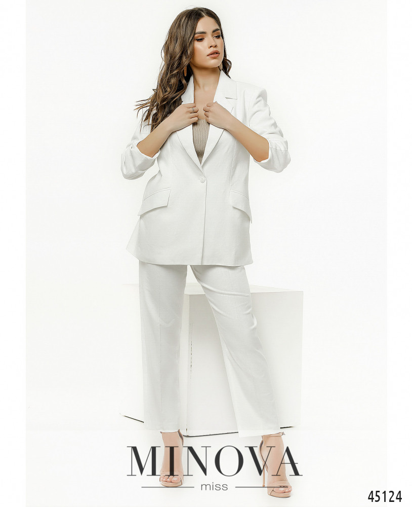 Стильный костюм-двойка с однобортным жакетом и классическими брюками. Лаконичный жакет с подкладкой и рукавами без манжет застегивается на одну пуговицу, по бокам дополнен декоративными клапанами-обманками, а сзади - шлицей. Брюки с высокой талией застегиваются спереди на змейку и пуговицу, а сзади в пояс вшита резинка, обеспечивающая идеальную посадку по фигуре.