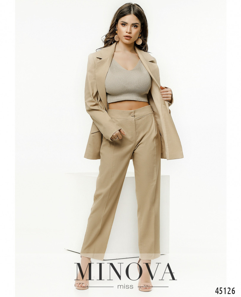 Стильный костюм-двойка с однобортным жакетом и классическими брюками. Лаконичный жакет с подкладкой и рукавами без манжет застегивается на одну пуговицу, по бокам дополнен декоративными клапанами-обманками, а сзади - шлицей. Брюки с высокой талией застегиваются спереди на змейку и пуговицу, а сзади в пояс вшита резинка, обеспечивающая идеальную посадку по фигуре.