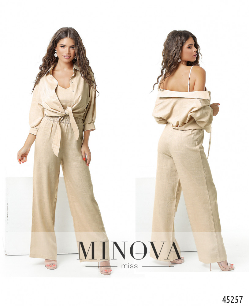 Стильный оригинальный костюм-двойка, выполненный из натуральной ткани, позволяет экспериментировать, создавая разные образы в зависимости от вашего настроения. Жарким летним днем наденьте легкий открытый комбинезон с широкой резинкой, делающей акцент на талии. Верхняя часть комбинезона на тонких бретелях оставляет открытыми плечи, а нижняя выполнена в виде легких свободных брюк прямого кроя. Вечером, когда жара спадет, накиньте сверху короткую рубашку в тон на пуговицах с рукавами длиной 3/4 и с завязками внизу.