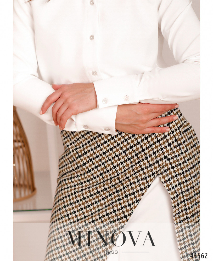Стильный костюм с длинной блузой и юбкой. Юбка застёгивается на молнию, вшитую по спинке, спереди подшита на запАх с глубоким вырезом. Карманов нет, шлеек для пояса тоже нет. Рубашка с отложным воротничком, спереди - ряд пуговиц на планке, манжеты с двумя пуговицами, карманов нет.