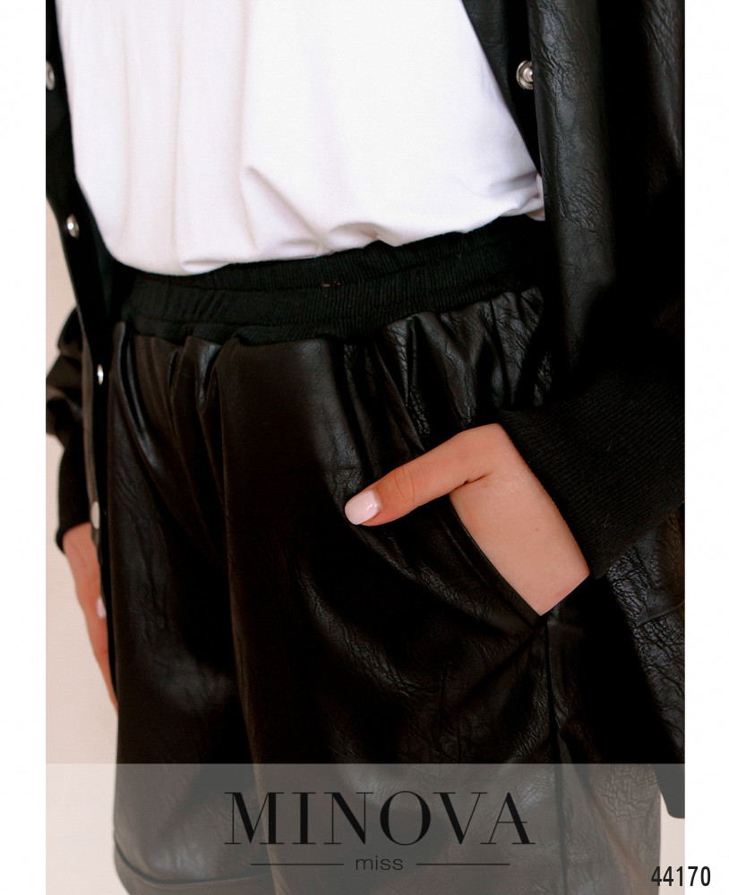 Стильный костюм с курточкой и шортами. Куртка без подкладки, мягкая изнутри. Застёгивается на ряд кнопок спереди по центру. Снизу манжет со вставками мягкой ткани. Манжеты на рукавах мягкие, без застёжек, горловина также с мягкой оторочкой. По бокам - карманы в шве. Шорты со вшитой в пояс резинкой, свободные, с высокой посадкой, по бокам - карманы в шве, снизу небольшие подвороты.