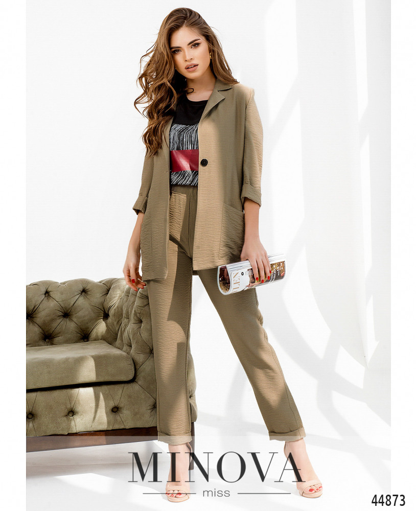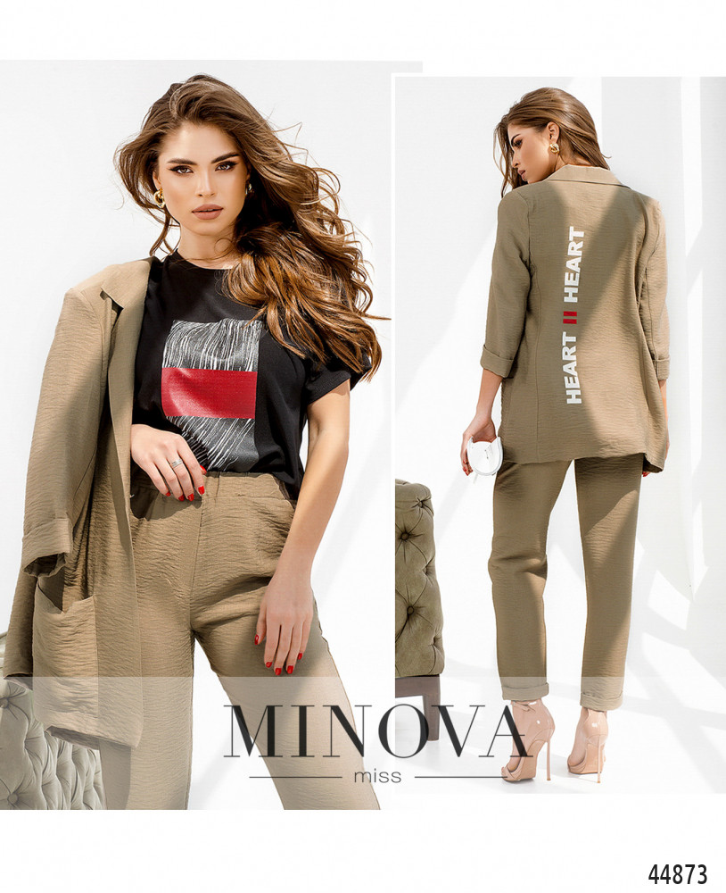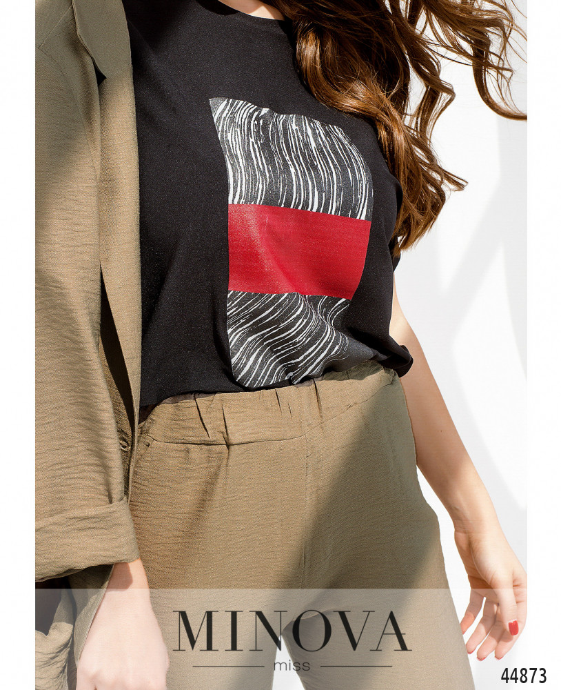 Элегантный костюм-тройка, в наличии пиджак, футболка и брюки. Брюки с высокой талией и карманами в шве, застёгиваются на молнию под ширинкой и пуговку. На талии шлейки для пояса, снизу на брючинах - отвороты. Футболка без застёжек и карманов, вырез горловины полукруглый, на груди принт. Пиджак с подплечниками, лацканы резные, рукава с отворотами, по бокам - накладные карманы. Подкладка - от плеча до середины. На спине принт. Застёгивается на одну пуговицу, однобортный.