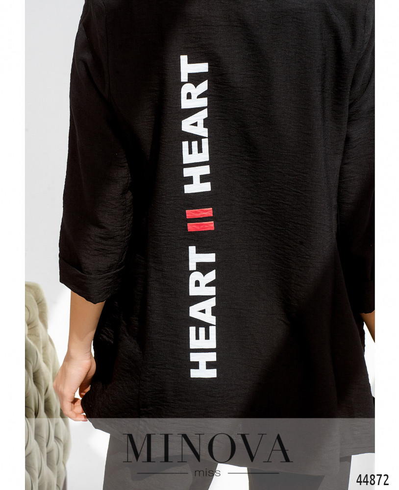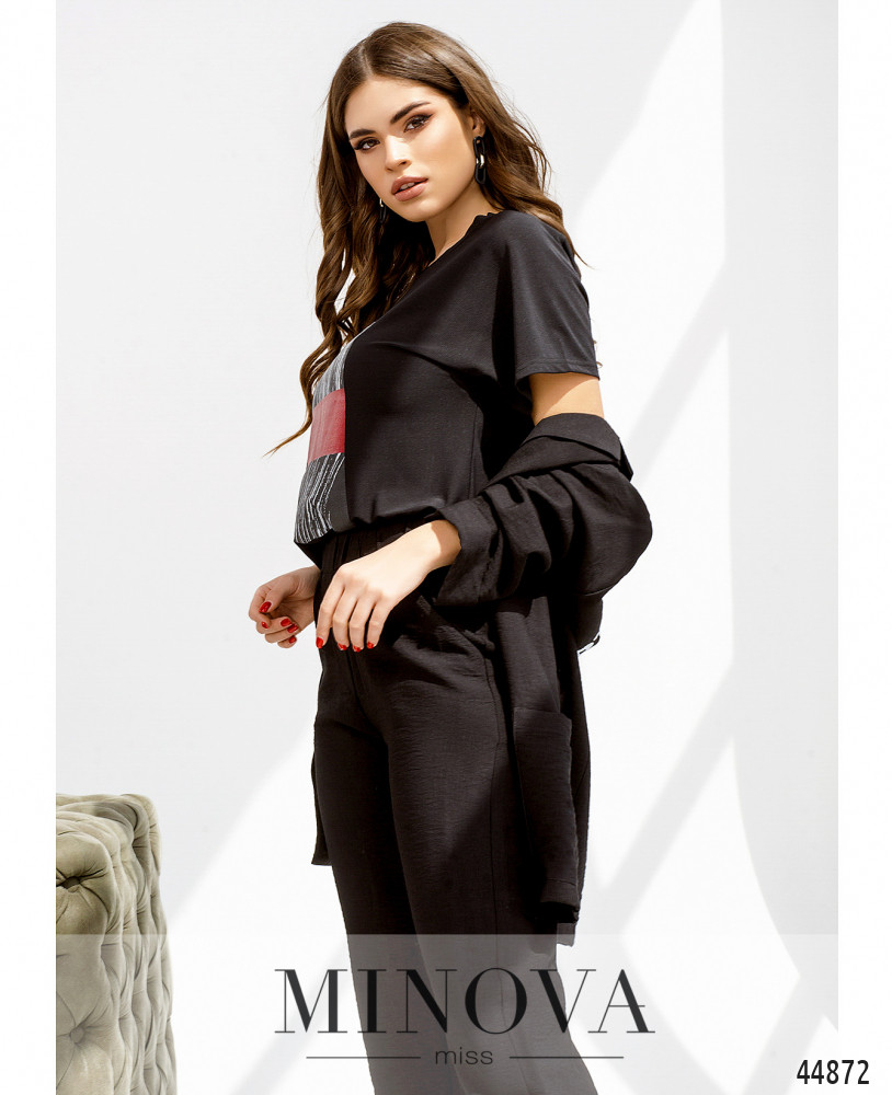 Элегантный костюм-тройка, в наличии пиджак, футболка и брюки. Брюки с высокой талией и карманами в шве, застёгиваются на молнию под ширинкой и пуговку. На талии шлейки для пояса, снизу на брючинах - отвороты. Футболка без застёжек и карманов, вырез горловины полукруглый, на груди принт. Пиджак с подплечниками, лацканы резные, рукава с отворотами, по бокам - накладные карманы. Подкладка - от плеча до середины. На спине принт. Застёгивается на одну пуговицу, однобортный.