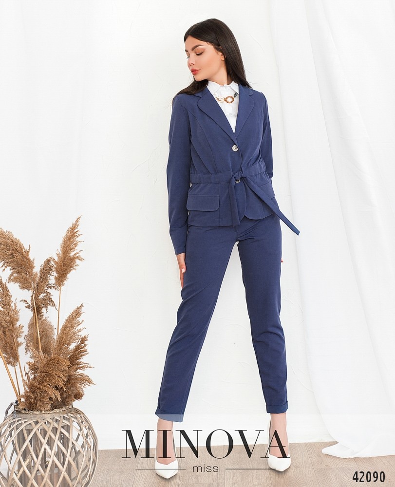 Стильный костюм-двойка в стиле casual. Пиджак без карманов и подкладки, на талии кулиска со шнурком. Однобортный, застёгивается на две пуговицы, под кулиской - декоративные клапаны, лацканы резные. Рукава без пуговиц. Брюки со средней посадкой, снизу манжеты, по бокам - врезные карманы, застёгиваются на молнию под ширинкой и пуговицу. Есть шлейки для пояса.