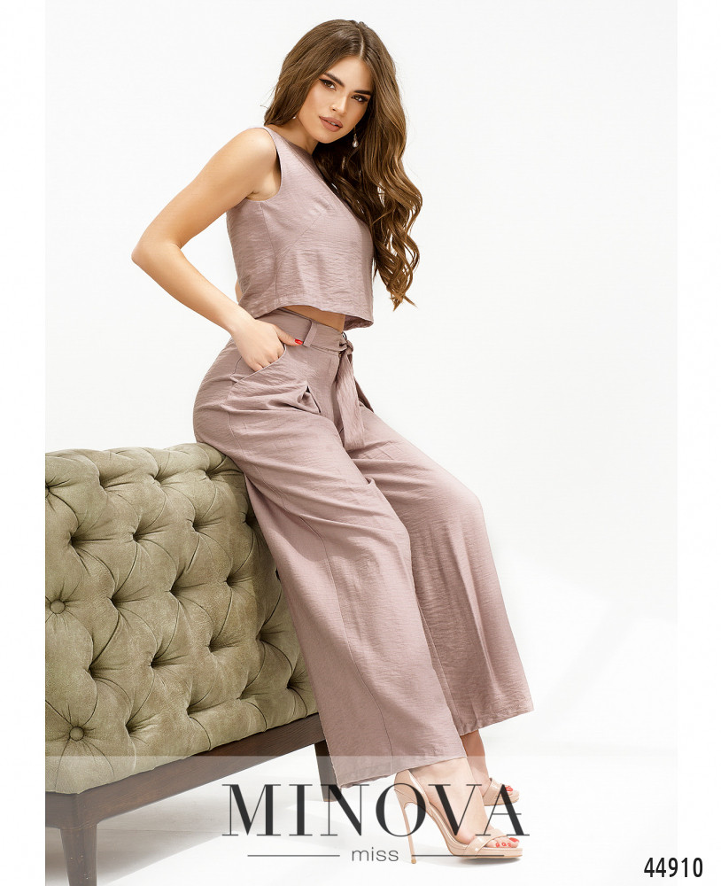 Минималистичный и оригинальный костюм, брюки расклешены, талия высокая, есть шлейки для пояса. Застёжка - молния под ширинкой и пуговка на талии. По бокам - карманы в шве, сзади на бёдрах от талии продольные вытачки. Топ без рукавов, карманов и застёжек, без резинки, вырез горловины спереди V-образный, сзади полукруглый.