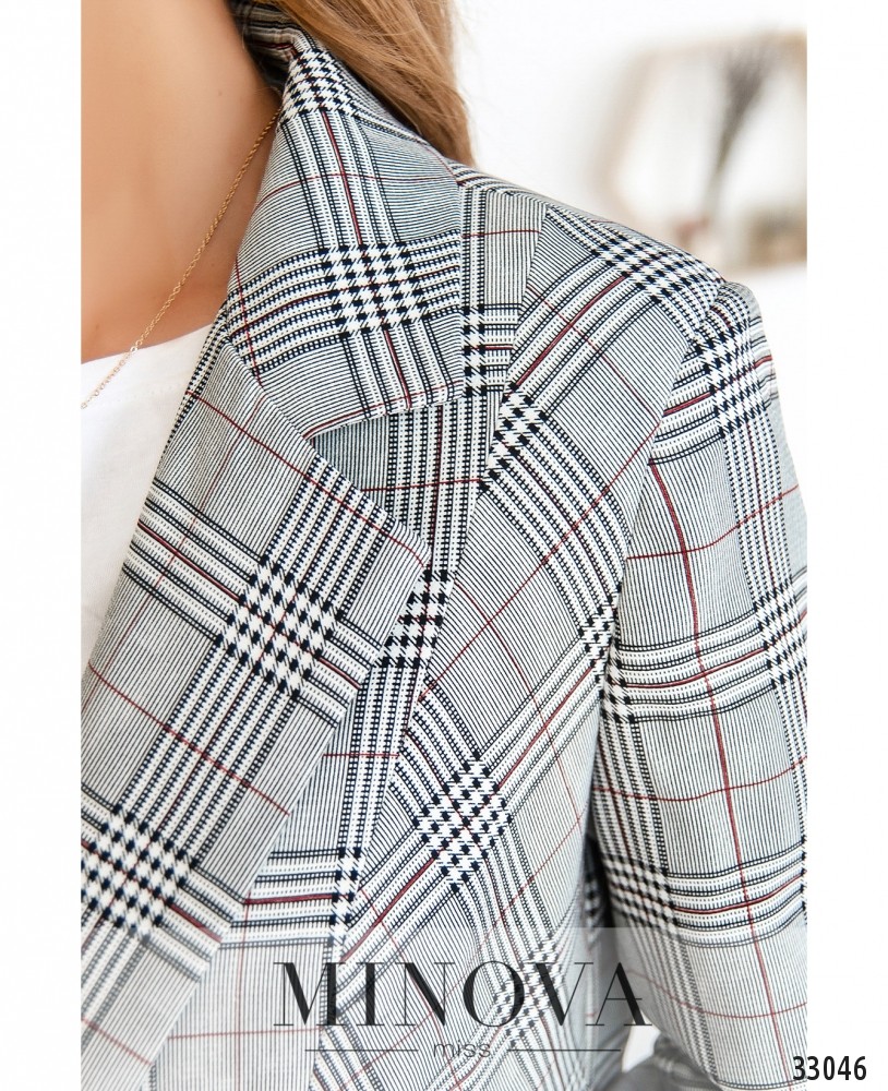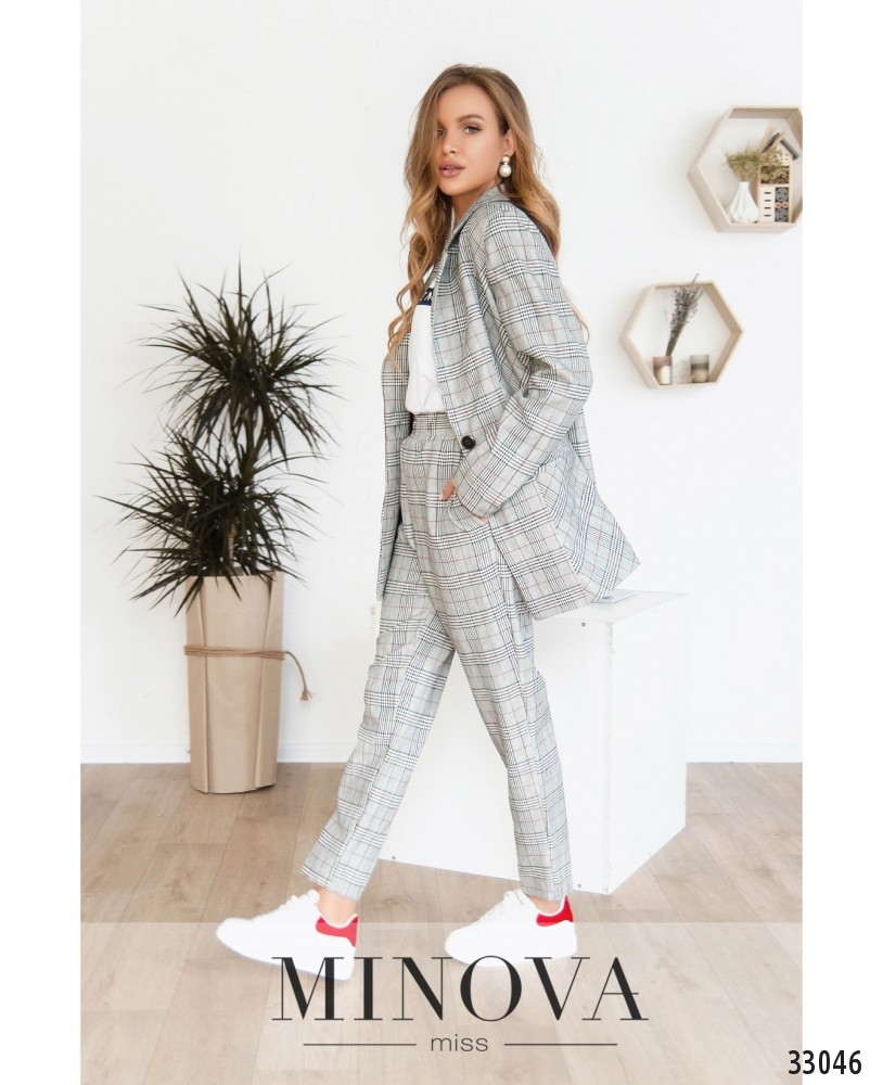 Создавая деловой офисный дресс-код, можно выбирать самые разные варианты: классические и неформальные. Minova предлагает множество вариаций на тему «костюм-двойка», представленная модель состоит из двух частей: пиджак с одной пуговицей и декоративными клапанами полной длины. Материал костюма плотный, изнутри – мягкая подкладка с мелкой частой перфорацией. Сзади снизу на спинке небольшой вырез. Брюки с подшитой в пояс резинкой, в наличии карманы. Прекрасный вариант для деловых встреч и создания образа бизнес-леди. Обувь лучше выбирать классическую, на каблуке любой высоты.