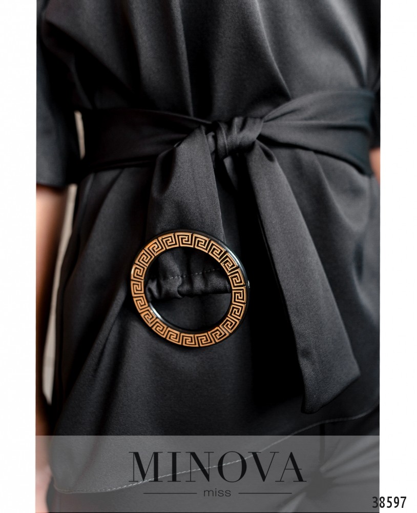 Строгий лёгкий костюм с брюками и блузой. Блуза с V-образным вырезом горловины, рукава немного расклешены, без манжет, застёжек и карманов нет. Брюки с высокой талией, с наглаженными «стрелками», застёгиваются на пуговицу и молнию под ширинкой, в пояс сзади вшита резинка, по бокам - карманы. В комплекте – пояс в тон с круглой пряжкой.