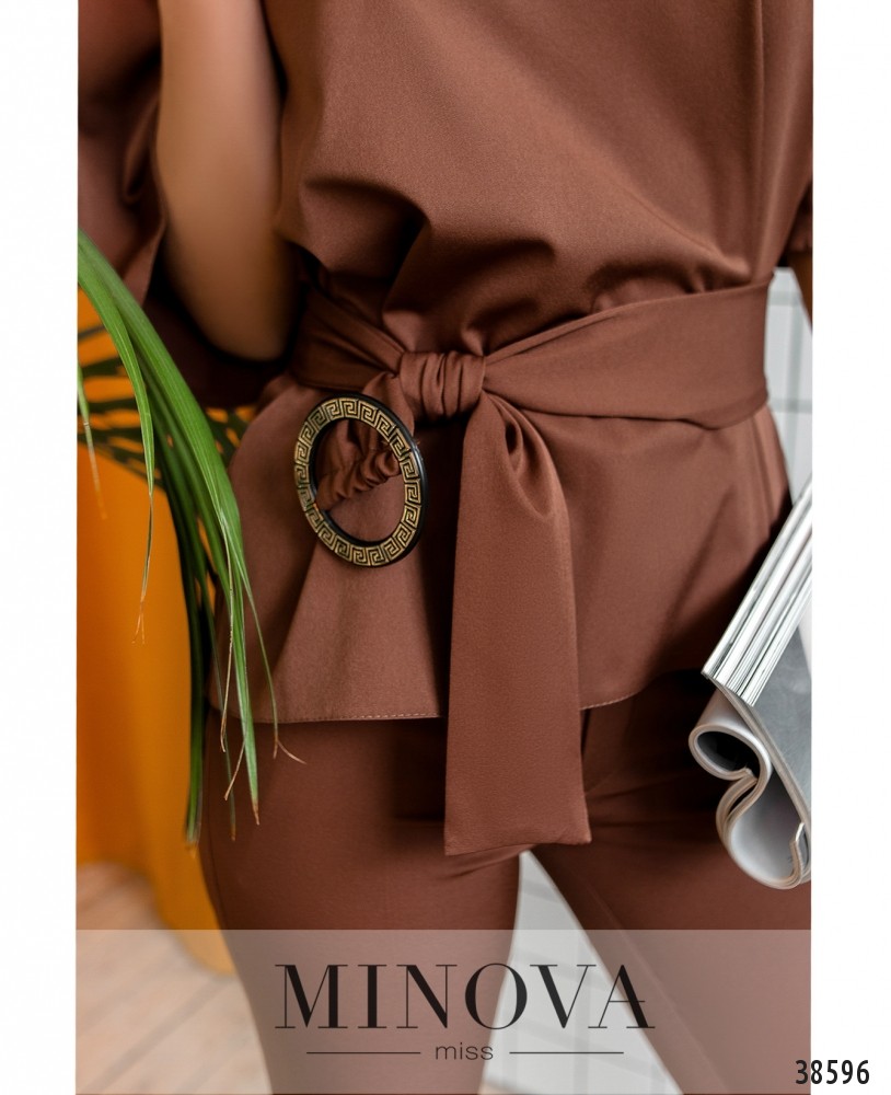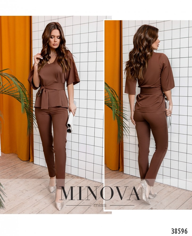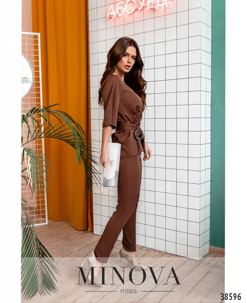 Строгий лёгкий костюм с брюками и блузой. Блуза с V-образным вырезом горловины, рукава немного расклешены, без манжет, застёжек и карманов нет. Брюки с высокой талией, с наглаженными «стрелками», застёгиваются на пуговицу и молнию под ширинкой, в пояс сзади вшита резинка, по бокам - карманы. В комплекте – пояс в тон с круглой пряжкой.