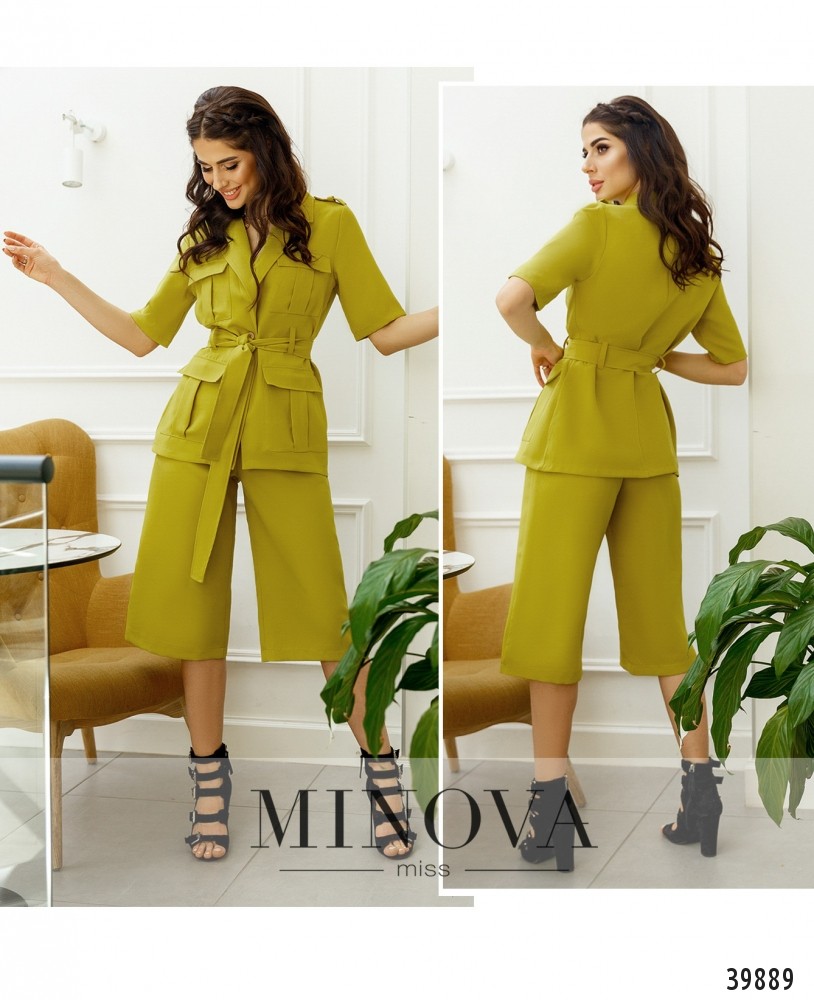 Привлекательный и оригинальный костюм-двойка с жакетом и расклешёнными брюками. Брюки с высокой талией, застёгиваются на пуговицу и змейку под ширинкой, по бокам - врезные карманы. Жакет без подкладки, с накладными карманами, с поясом в комплекте. На плечах - погончики.