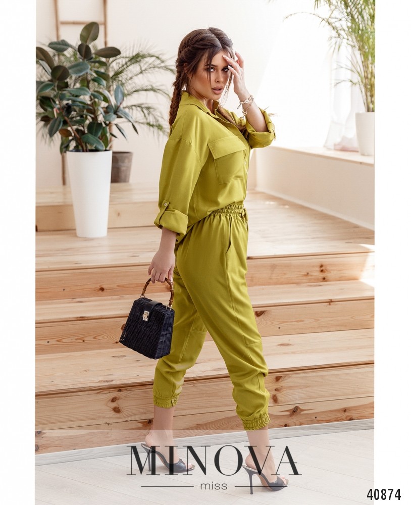 Элегантный костюм с рубашкой и брюками, рубашка с отложным воротничком и рядом пуговиц спереди на планке, на груди - накладные карманы с клапанами. Рукава с регулируемыми лентами. Брюки с высокой талией, без застёжек, в пояс вшит шнурок и резинка, по бокам - врезные карманы, в манжетах также резинки.