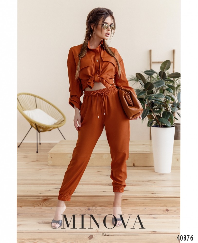 Элегантный костюм с рубашкой и брюками, рубашка с отложным воротничком и рядом пуговиц спереди на планке, на груди - накладные карманы с клапанами. Рукава с регулируемыми лентами. Брюки с высокой талией, без застёжек, в пояс вшит шнурок и резинка, по бокам - врезные карманы, в манжетах также резинки.