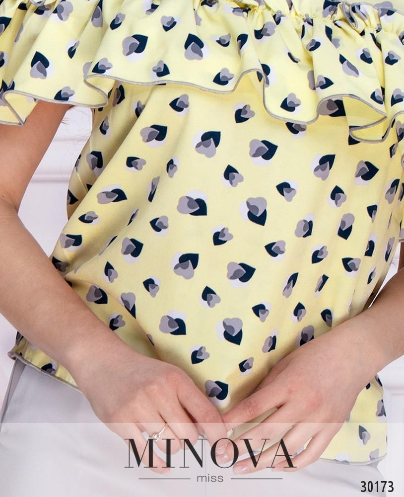 Костюм-двойка с принтованной блузой и однотонными брюками. Игривая блуза прямого кроя с лентой на одном плече и воланами. Блуза прямого кроя завязывается на ленту на одно плечо. Брюки с поясом-планкой с лентами.