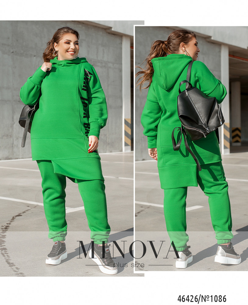 Яркий спортивный костюм, дополненный контрастными принтами, не только очень теплый, но и комфортный. В комплект входят лаконичные брюки-джоггеры с карманами в боковых швах и резинками, вшитыми по линии талии и по низу штанин, а также удлиненная туника-худи в тон с ассиметричным низом, дополненная капюшоном и длинными рукавами с приспущенной линией плеч. Пояс НЕ входит в комплект.