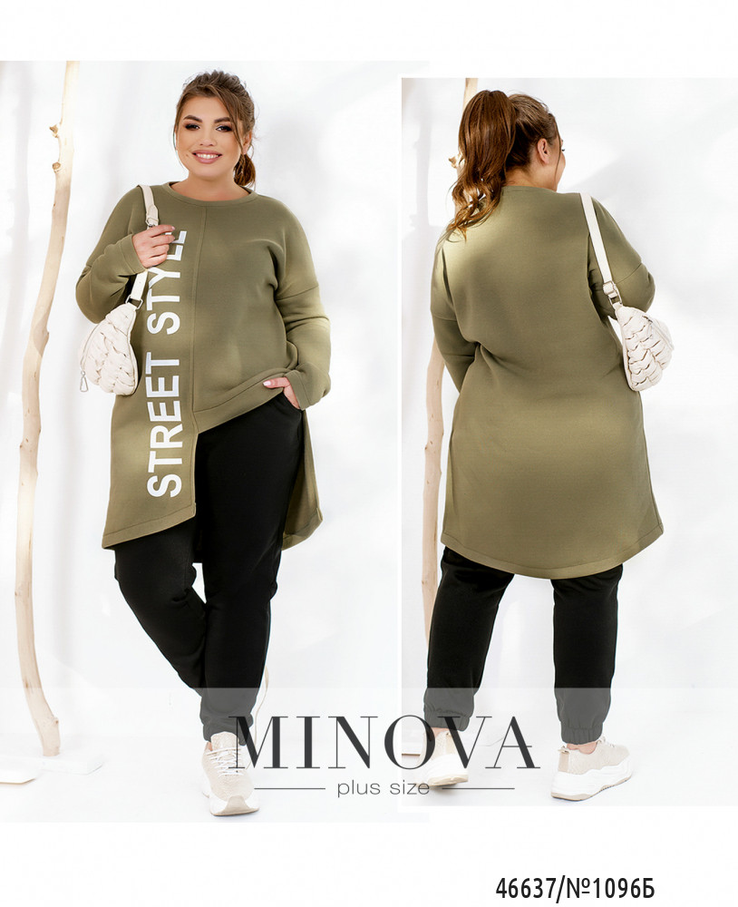 Контрастный спортивный костюм, дополненный принтами, отлично сочетается с кроссовками и объемными джинсовыми куртками. В комплект входят лаконичные брюки-джоггеры с карманами в боковых швах и резинками, вшитыми по линии талии и по низу штанин, а также удлиненная туника-свитшот с ассиметричным низом, дополненная длинными рукавами с приспущенной линией плеч. Пояс НЕ входит в комплект.