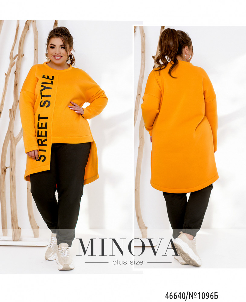 Контрастный спортивный костюм, дополненный принтами, отлично сочетается с кроссовками и объемными джинсовыми куртками. В комплект входят лаконичные брюки-джоггеры с карманами в боковых швах и резинками, вшитыми по линии талии и по низу штанин, а также удлиненная туника-свитшот с ассиметричным низом, дополненная длинными рукавами с приспущенной линией плеч. Пояс НЕ входит в комплект.
