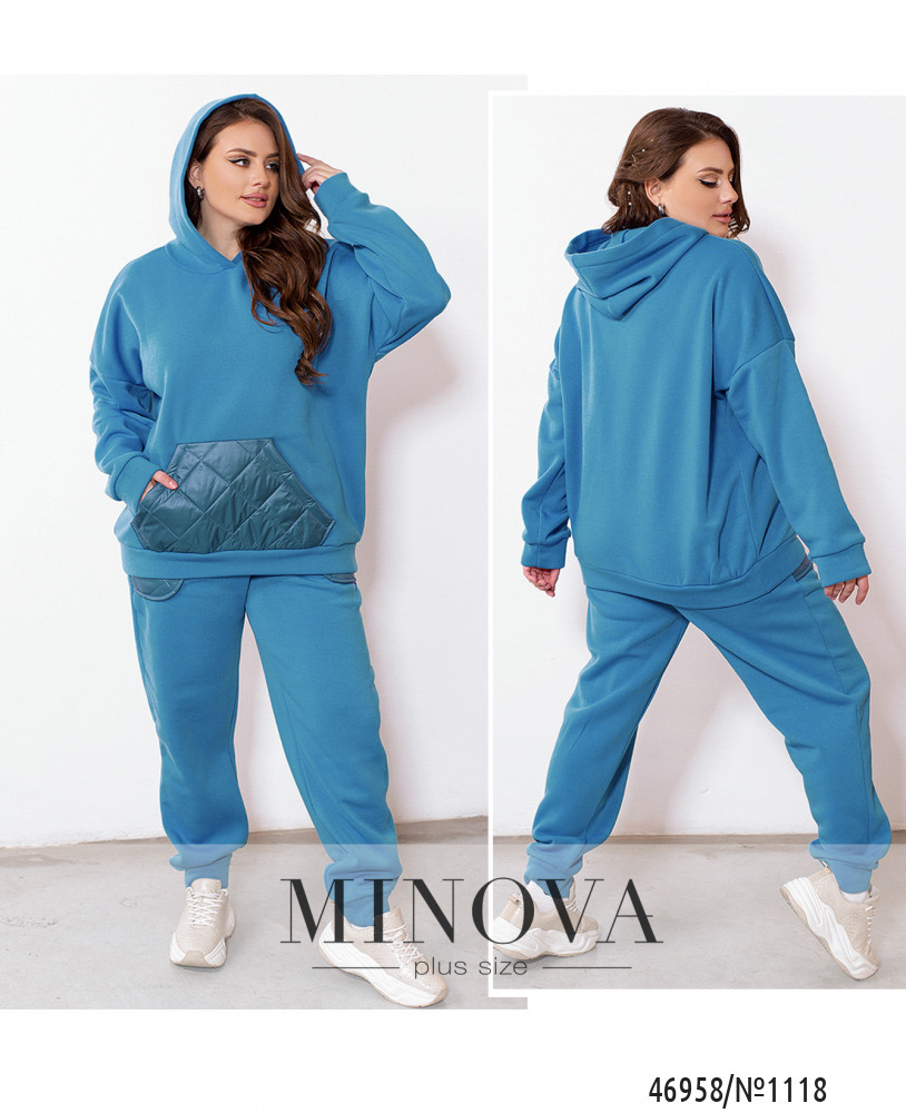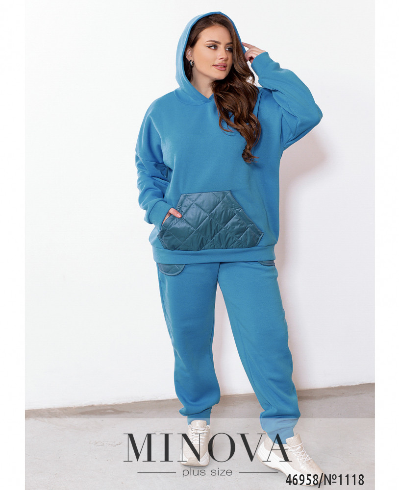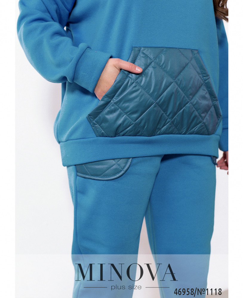 Оригинальный спортивный костюм может стать любимой вещью для женщины, ценящей практичность и не забывающей о модных тенденциях. В комплект входят однотонные брюки-джоггеры на резинке с накладными карманами, выполненными из стеганой плащевой ткани, а также модное худи с капюшоном и таким же стеганым карманом-кенгуру, как и на брюках.