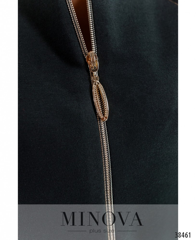 Милый и оригинальный однотонный костюм-двойка батал с кофточкой и брюками. Кофточка на молнии спереди, застёгивается на два бегунка, подол асимметричный, слева короче. Слева подшит накладной контрастный карман. Рукава без манжет. Брюки с высокой талией, в пояс вшита резинка, с мягкими манжетами снизу, по бокам - декоративные молнии во всю длину, также с двумя бегунками, в наличии карманы.