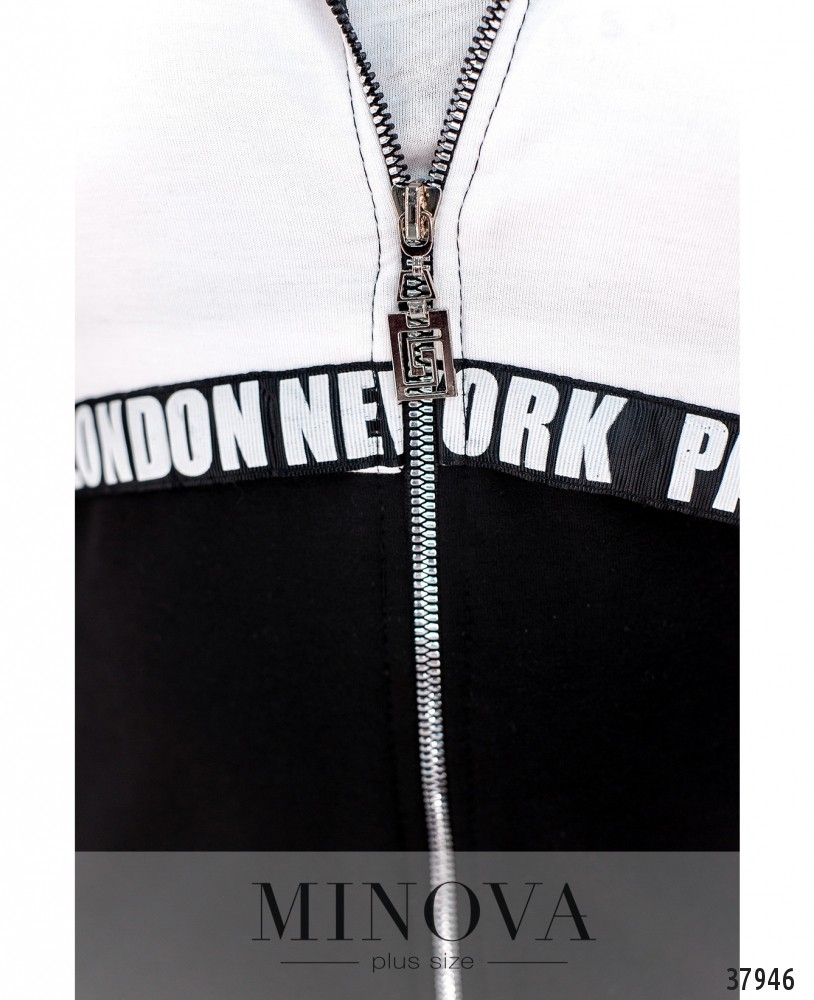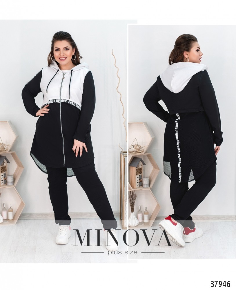 Привлекательный городской костюм-двойка батал в спортивном стиле. Брюки с высокой талией, по бокам карманы, в пояс вшита резинка. Кофта длинная, с асимметричным подолом. В наличии капюшон, через него пропущен шнурок. Застёгивается на молнию по центру. На спинке от талии подшита сеточка с продольной декоративной лентой по центру. На груди вытачки. Рукава без манжет, карманов нет.