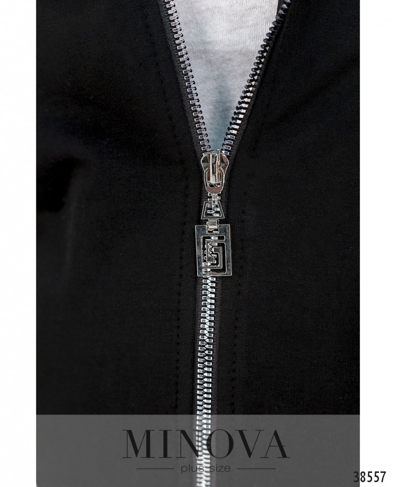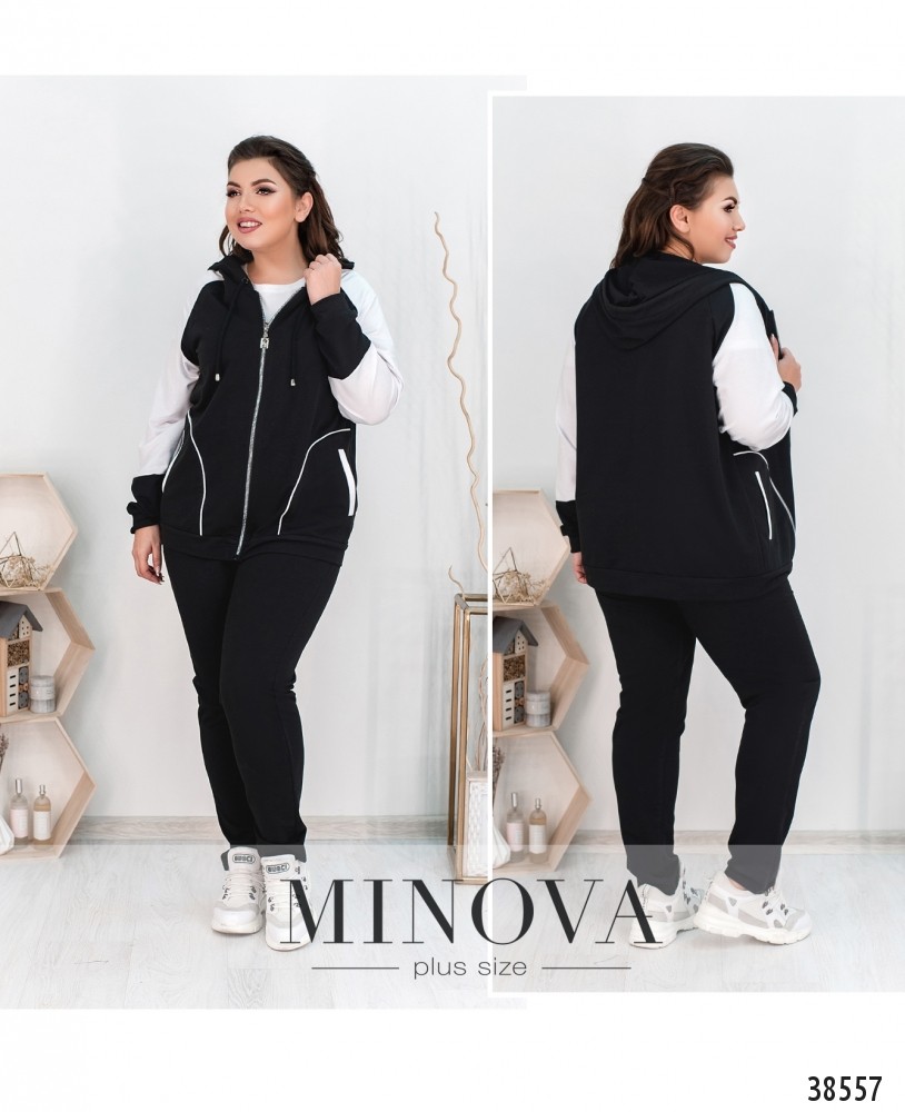 Удобный повседневный костюм-двойка плюс сайз с кофтой и брюками. Кофта с капюшоном, через капюшон пропущен шнурок, по бокам – врезные карманы и декоративные швы. Рукава с мягкими манжетами. Застёгивается на молнию по центру. Брюки с высокой посадкой, вшитой в пояс резинкой, по бокам врезные карманы.