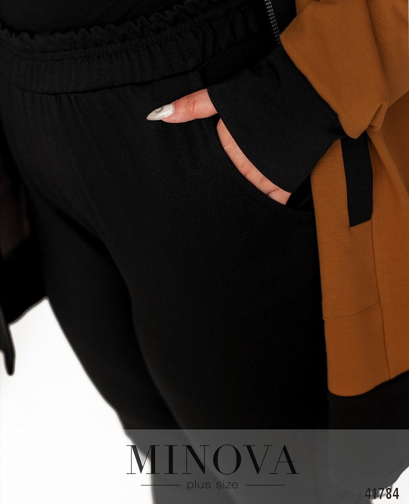 Мягкий и удобный костюм-двойка плюс сайз. Свитшот с капюшоном, по бокам - врезные карманы, застёгивается на молнию по центру, по бокам подола скруглённые разрезы. Брюки с высокой талией и вшитой в пояс резинкой, в наличии карманы.