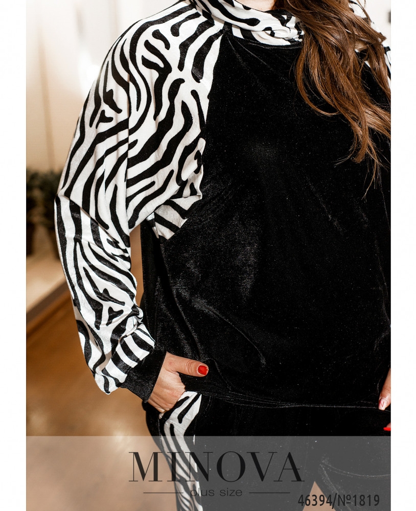 Уютный спортивный костюм, выполненный из мягкого велюра, поможет создать действительно стильный и яркий образ. Контрастные вставки с анималистичным принтом на рукавах, капюшоне и брюках делают эту модель уникальной. В комплект входит теплый худи с рукавами "реглан", капюшоном и манжетами, а также брюки на резинке с карманами в боковых швах и лампасами.