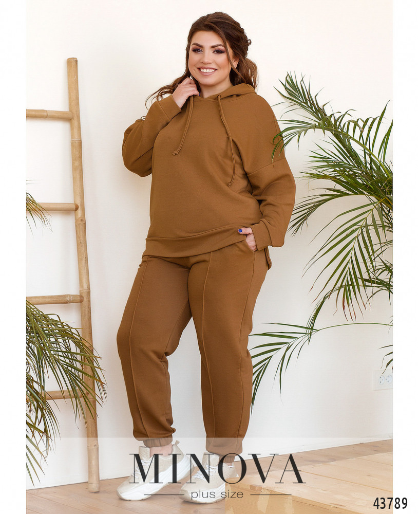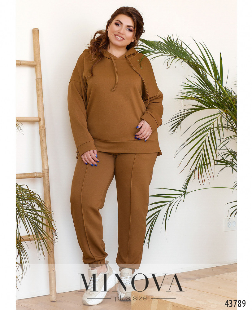 Комфортный и элегантный спортивный костюм большого размера из модной и практичной натуральной ткани. Толстовка с капюшоном, через него пропущен шнурок; карманов и застёжек нет, рукава и подол с мягкими манжетами. По бокам подола небольшие разрезы, спинка немного длиннее. Брюки со вшитой в пояс и в манжеты резинкой, посадка высокая, по бокам - карманы.
