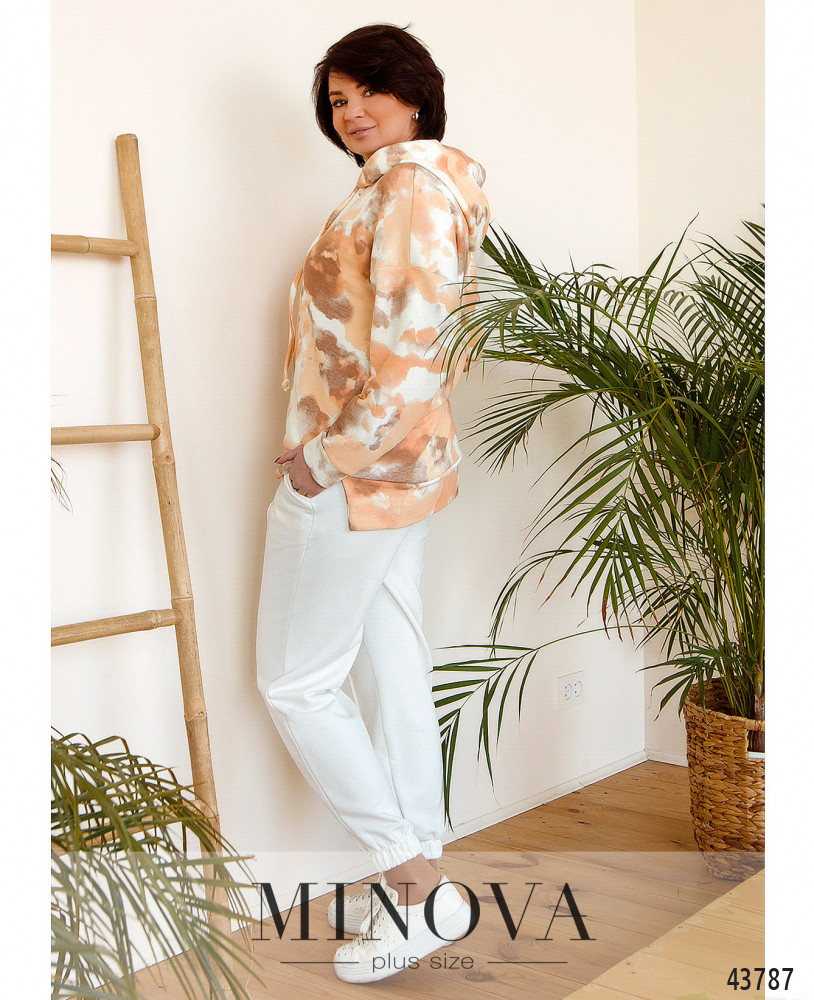 Комфортный и элегантный спортивный костюм большого размера из модной и практичной натуральной ткани. Толстовка с капюшоном, через него пропущен шнурок; карманов и застёжек нет, рукава и подол с мягкими манжетами. По бокам подола небольшие разрезы, спинка немного длиннее. Брюки со вшитой в пояс и в манжеты резинкой, посадка высокая, по бокам - карманы.