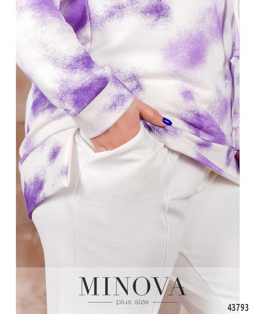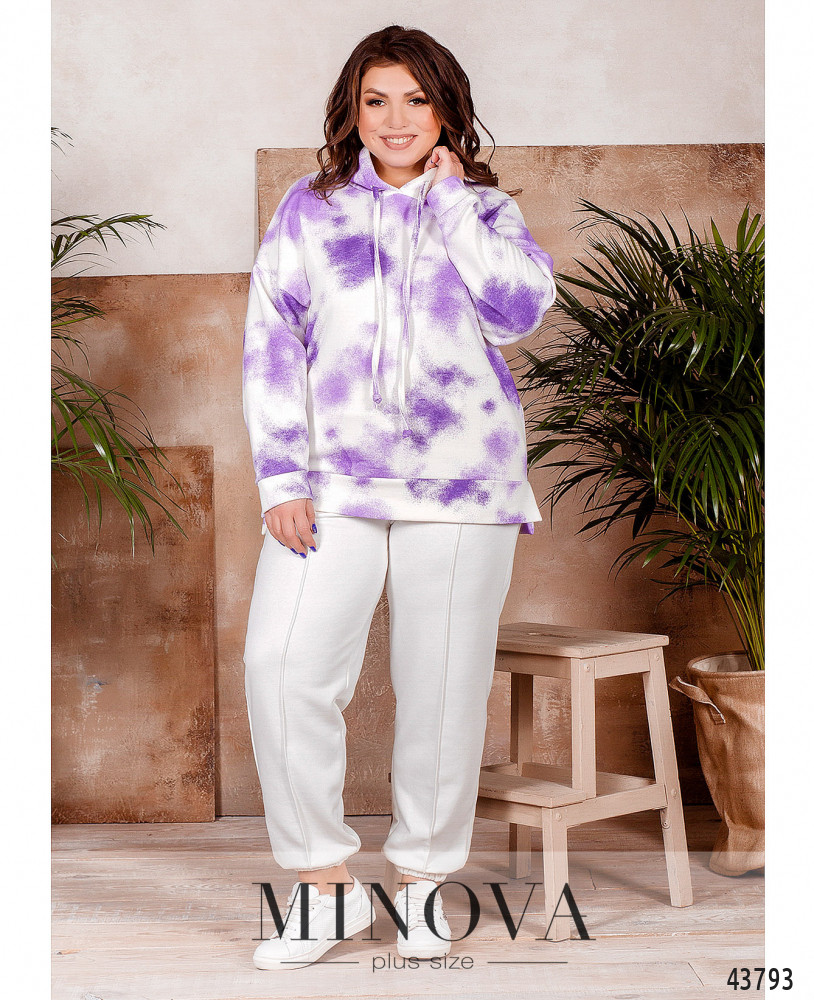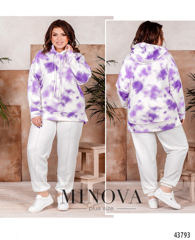 Комфортный и элегантный спортивный костюм большого размера из модной и практичной натуральной ткани. Толстовка с капюшоном, через него пропущен шнурок; карманов и застёжек нет, рукава и подол с мягкими манжетами. По бокам подола небольшие разрезы, спинка немного длиннее. Брюки со вшитой в пояс и в манжеты резинкой, посадка высокая, по бокам - карманы.